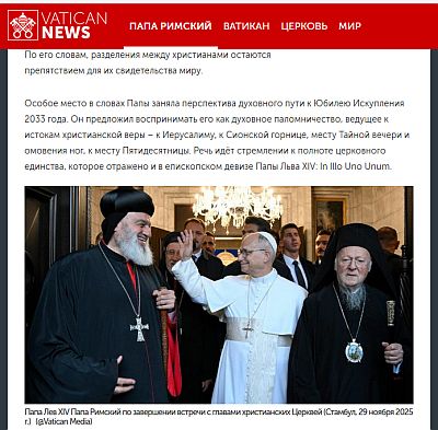 "Особое место в словах Папы заняла перспектива духовного пути к Юбилею Искупления 2033 года. Он предложил воспринимать его как духовное паломничество, ведущее к истокам христианской веры – к Иерусалиму, к Сионской горнице, месту Тайной вечери и омовения ног, к месту Пятидесятницы. Речь идёт стремлении к полноте церковного единства, которое отражено и в епископском девизе Папы Льва XIV: In Illo Uno Unum."